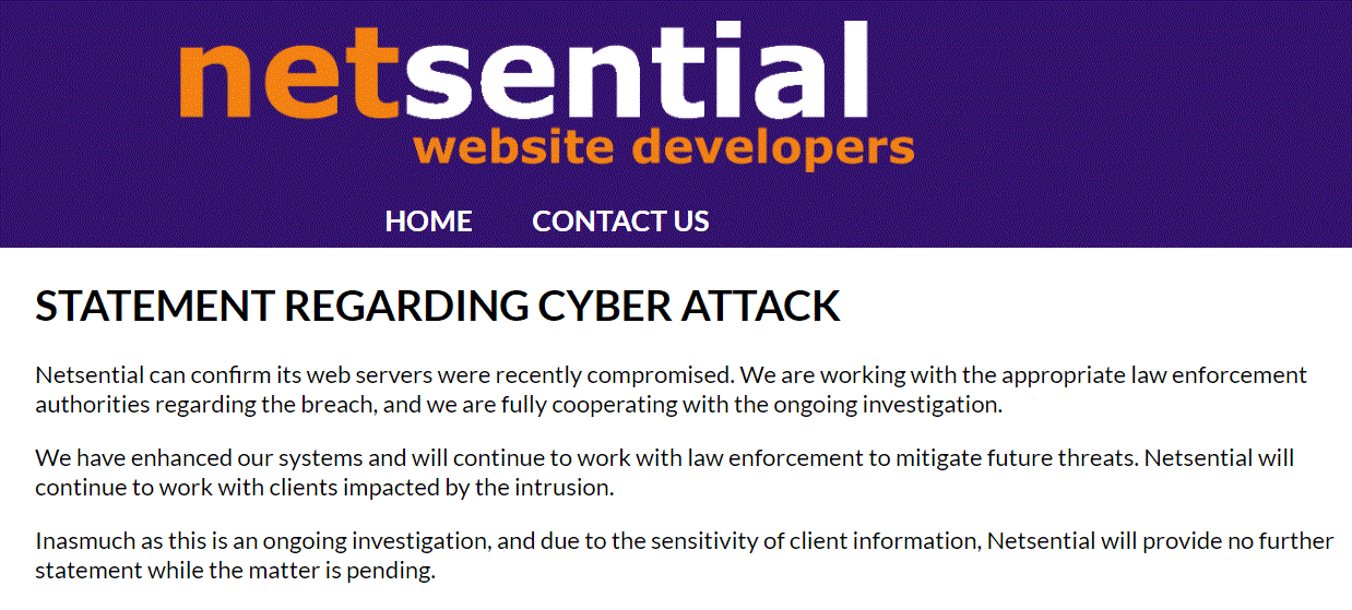 "Netsential can confirm its web servers were recently compromised... Inasmuch as this is an ongoing investigation, and due to the sensitivity of client information, Netsential will provide no further statement while the matter is pending."