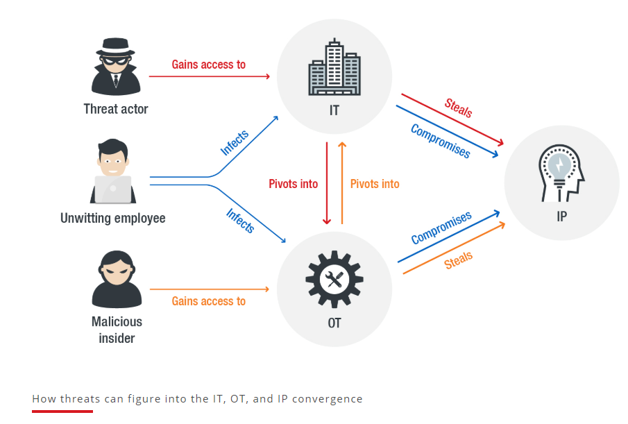 Information technology (IT), operational technology (OT), and intellectual property (IP) assets are becoming integrated.