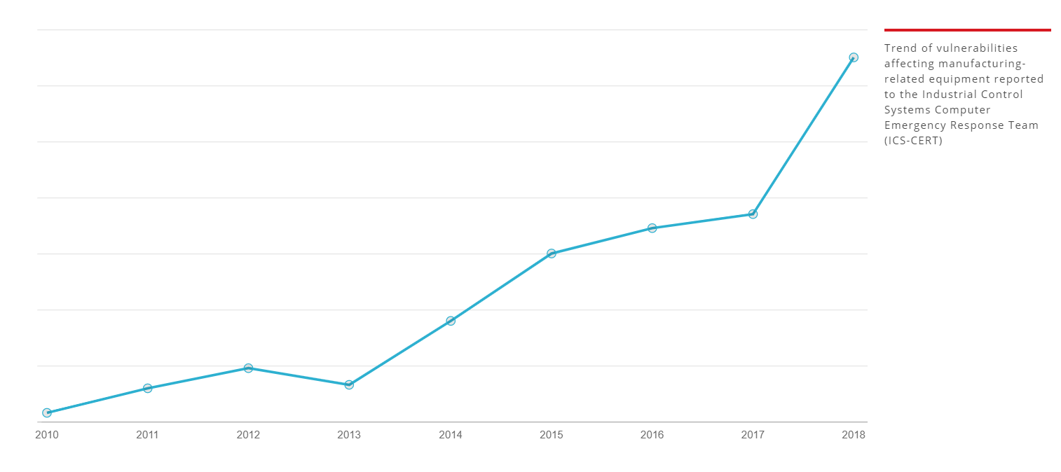 For starters, look at the rise in the number of cyber vulnerabilities reported in manufacturing related equipment since 2010.