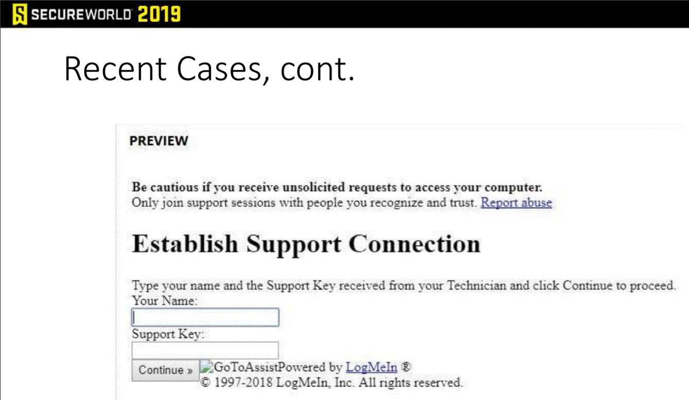 He shared recent examples his firm's clients have faced, including spoofed services that warn users to be cautious—kind of a reverse psychology approach: