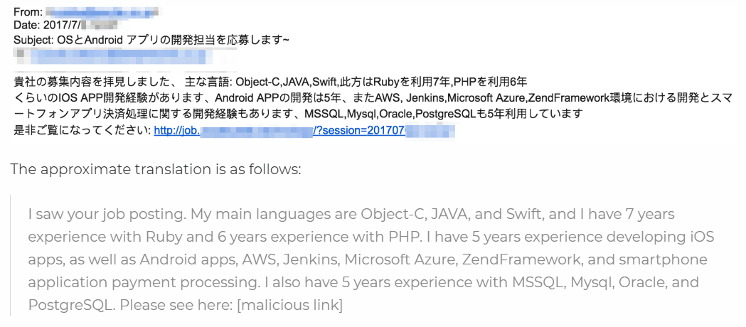 And bad actors have also tried to phish their way in through HR teams; here's an example from Japan which is translated below: