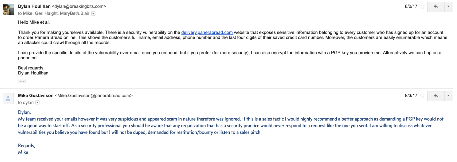 I just finished reading a really interesting post by security researcher Dylan Houlihan, who alerted Panera of the problem that then persisted for eight months.