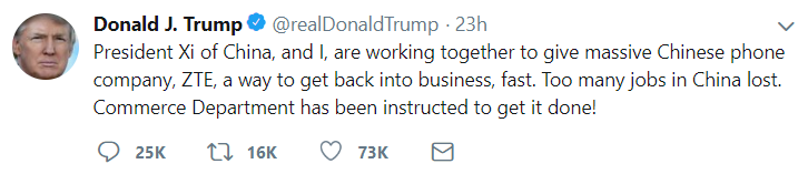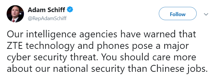 And Democratic Congressman Adam Schiff has this to say in response to Trump's tweet on ZTE: