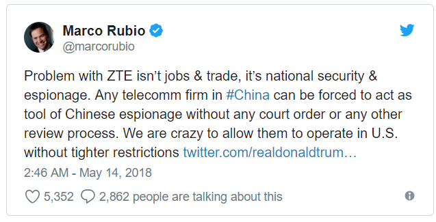 Republican Senator Marco Rubio tweeted about ZTE: